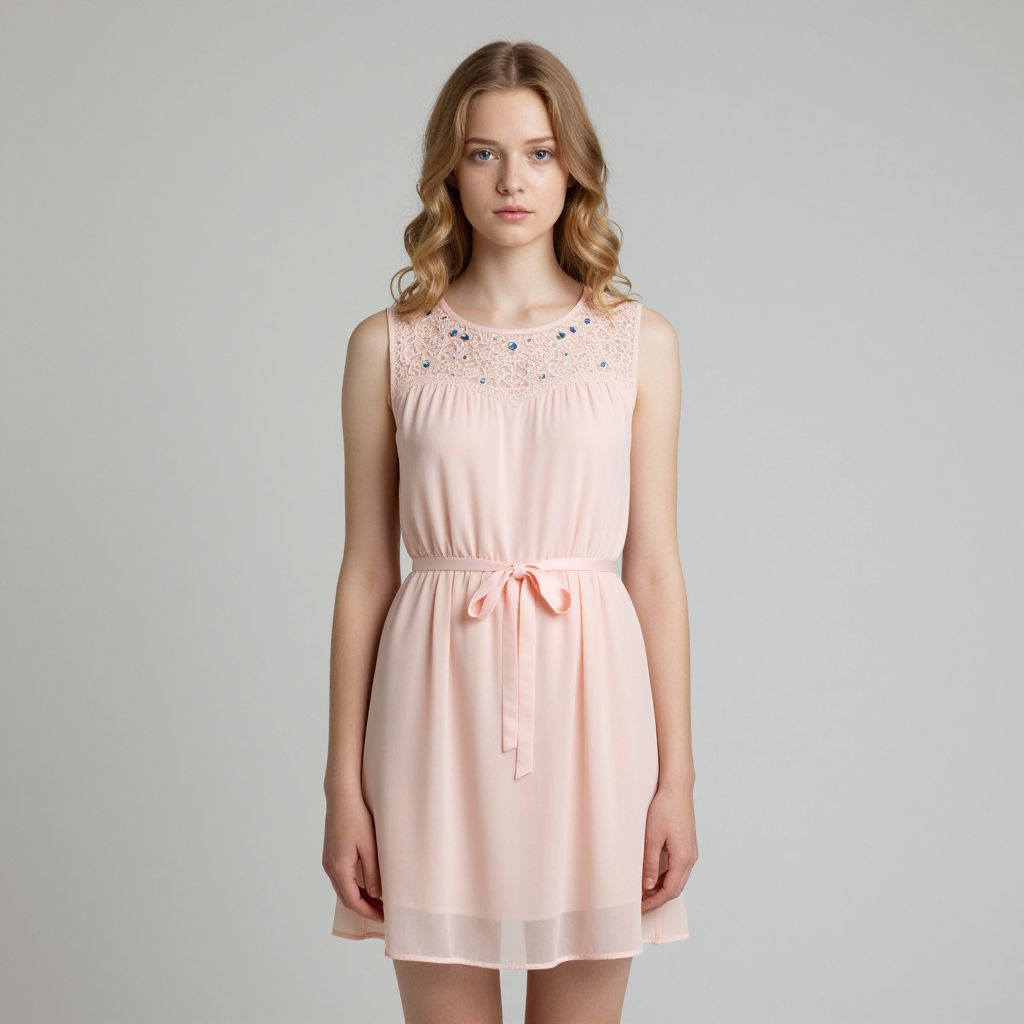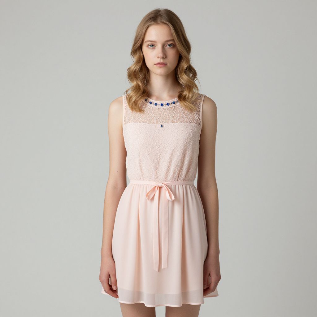 Photograph of a young woman with light blonde, wavy hair and fair skin standing against a plain, light gray background. She wears a sleeveless, pale pink dress with a delicate lace neckline adorned with small blue gemstones and a matching pink ribbon tied at the waist. Her expression is neutral, and she stands facing the camera with her arms relaxed by her sides.