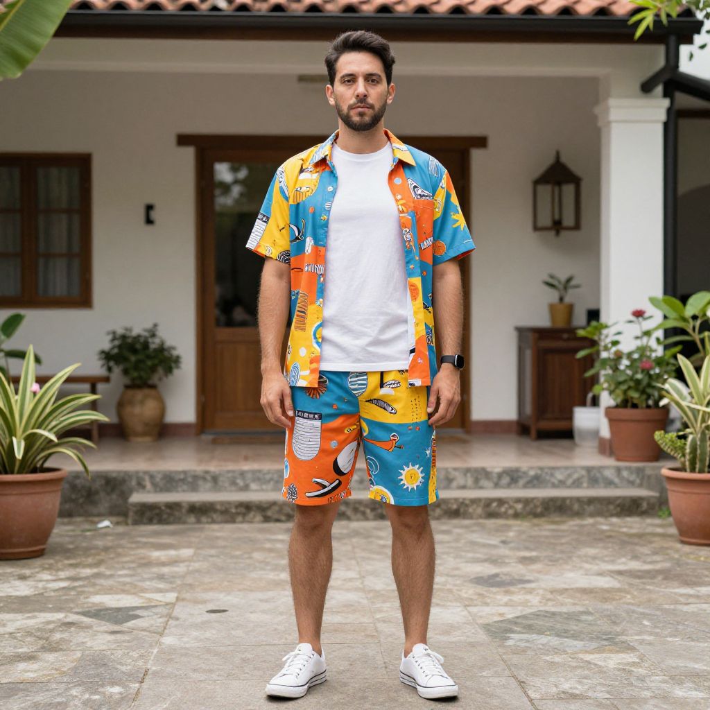 Photograph of a bearded man standing outdoors in front of a white building with a tiled roof. He wears a colorful, short-sleeve Hawaiian shirt with orange, blue, and yellow patterns, paired with matching blue and orange shorts, and white sneakers. He has a medium build, dark hair, and a watch on his left wrist. The background includes potted plants on either side, a wooden door, and a lantern. The stone-paved ground is visible, and the scene is brightly lit with natural daylight.