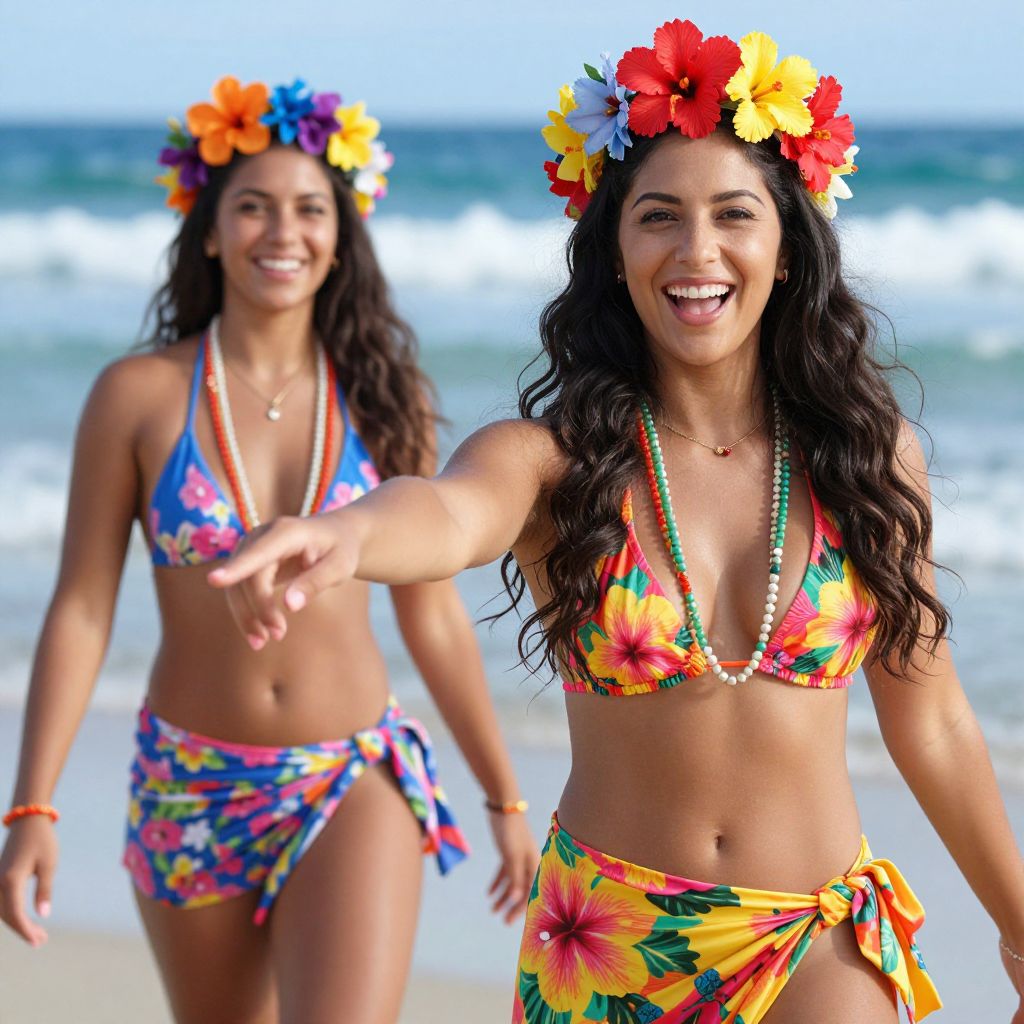 Photograph of two smiling women with dark, wavy hair, wearing colorful floral bikinis and flower crowns, walking on a sunny beach. The woman in the foreground, with a vibrant yellow and red floral bikini, is extending her right arm towards the camera, her teeth showing in a joyful expression. The woman in the background, in a blue and pink floral bikini, is slightly blurred. The ocean waves and bright blue sky form the background, adding a lively beach atmosphere. Both women have tan skin and wear beaded necklaces. The image is vibrant and cheerful, capturing a carefree, tropical moment.