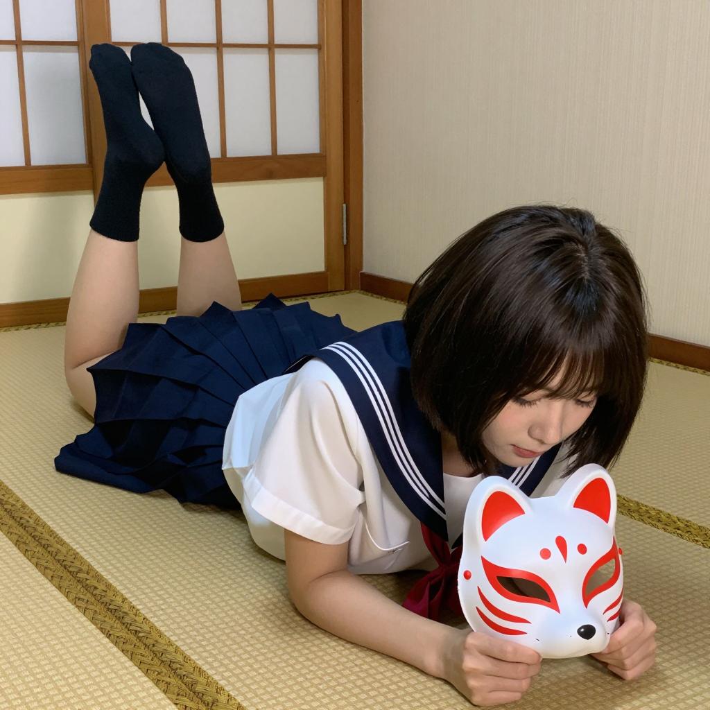 Young woman with pale skin and black hair wearing a white blouse, blue plaid skirt, and holding a colorful fox mask. She stands in a field of tall, fluffy grass with sunlight filtering through. Her expression is neutral. She has a black hairband and bangs. Her right hand holds the mask close to her chest while her left hand is extended slightly downward. The background consists of dense green grass and plants. The image is a photograph.