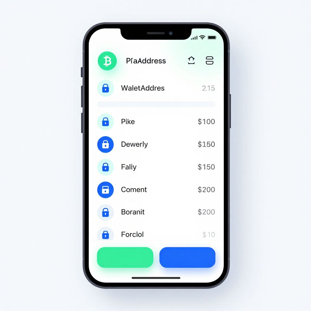 A fake crypto wallet screenshot displaying a vibrant summary of transactions, wallet address, and security features, styled as a clean and minimalistic mobile app interface with neon highlights and crisp typography.