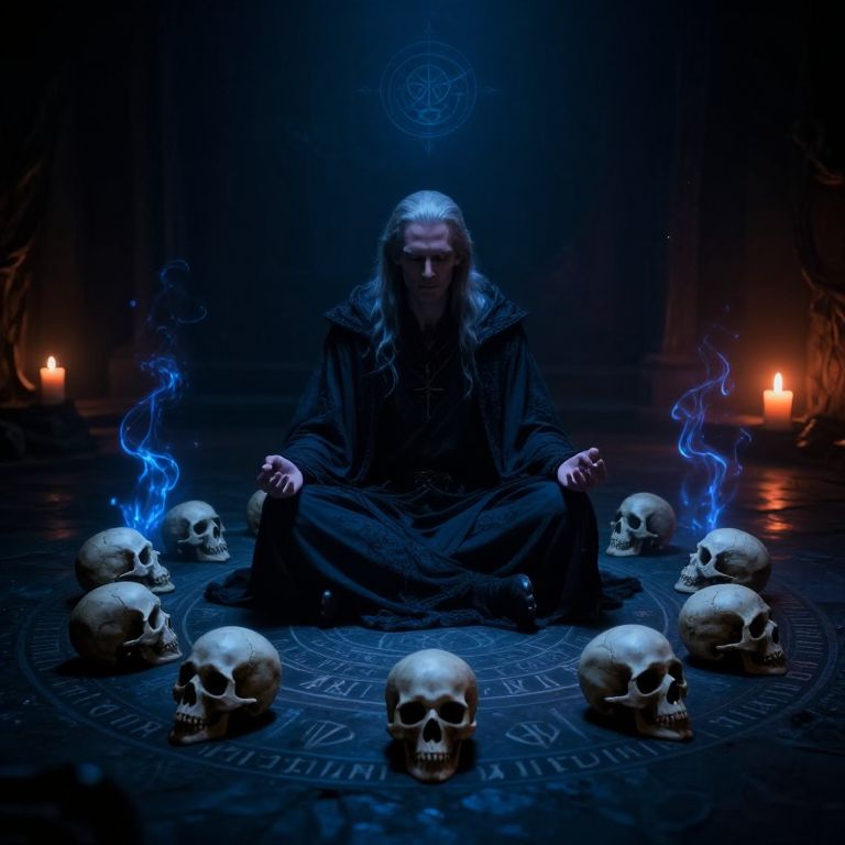 Male necromancer art, meditating in a circle of enchanted skulls and bones, surrounded by floating necrotic energy and mystical sigils, ancient runes glowing faintly on the ground, dark and moody atmosphere with contrasting warm orange candlelight and cold blue shadows.