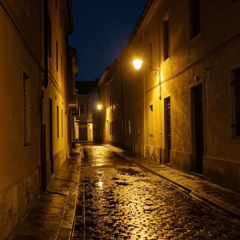 Narrow, cobblestone street at night, illuminated by warm yellow streetlights, reflecting on wet pavement. Dark, historic buildings on either side,