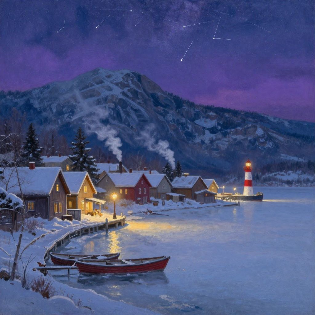 Score_9, score_8_up, score_7_up, score_6_up, score_5_up, Realistic oil painting, Snowy village, Twilight atmosphere, Dimly lit, Icy blue and purple hues, Mountain backdrop, Smoke from chimneys, Frozen lake, Dock, Rowboats, Lighthouse, Radiating warm light, Guiding a lost ship, Calm sea, Winter constellations, Starry night, Serene, Peaceful, Magical, Detailed, High resolution, Vibrant colors, Brush stroke texture, High contrast, Masterpiece, Nintendo design, gray, red, (Masterpiece:1.3) (best quality:1.2) (high quality:1.1)