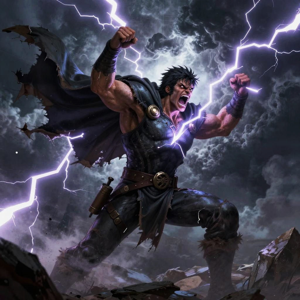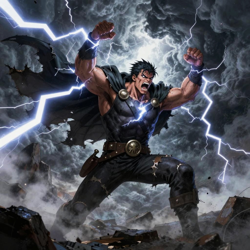 Harbinger of the storm skies, rage roars with each thunderclap, in comic book style, amid crackling lightning strikes, with tattered cape billowing, violent tempest clouds surround