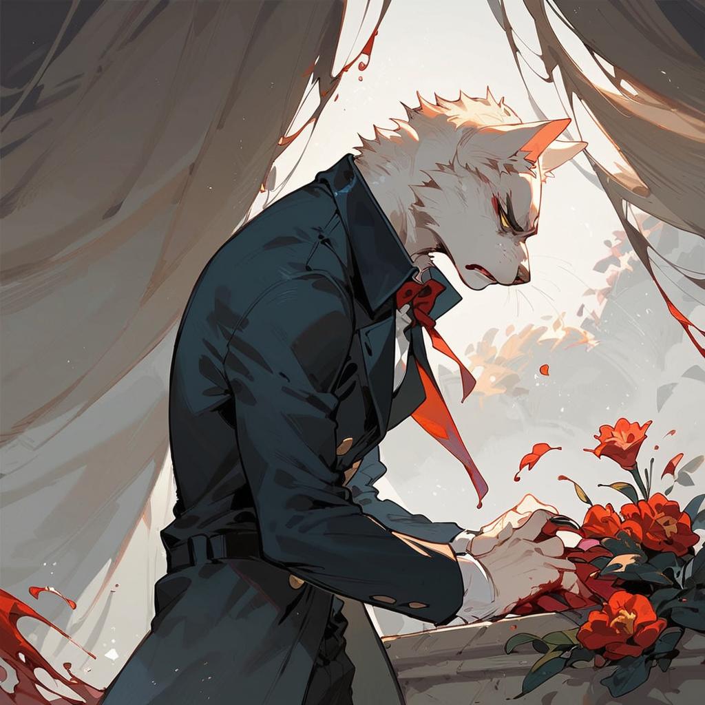Score_9, score_8_up, score_7_up, cat anthro boy, flower, blood, claws, (detective, comic cover, dutch angle), glaring, shadow, high contrast, skinny, formal, upper body, looking away, leaning, pose, body, trench coat, from side
