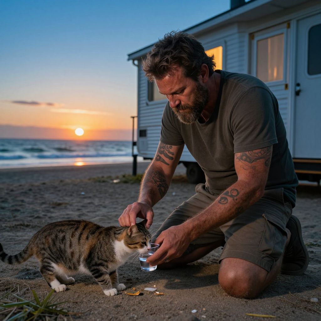 In this photorealistic and hyper-detailed image, a tough-looking middle-aged man with a rugged appearance and a full beard is seen kneeling on the ground, feeding a cute street cat. The man, wearing a t-shirt and shorts, has tattoos on his arms, adding to his rugged look. He is holding a cup of water, which the cat is drinking from. The scene is set during the blue hour, with the sun setting in the background, casting a warm glow over the mobile home and the beach shoreline. The ocean is visible in the distance, with gentle waves lapping against the shore. The overall composition is cinematic, with the man and the cat as the central focus, surrounded by the serene beach environment. The textures of the man's clothing, the cat's fur, and the mobile home's exterior are highly detailed, creating a sense of depth and realism. The spatial relationships between the objects are well-defined, with the man and the cat positioned in the foreground, the mobile home and the shoreline in the mid-ground, and the ocean and the setting sun in the background. The interplay of colors, textures, and shapes creates a visually rich and engaging scene.