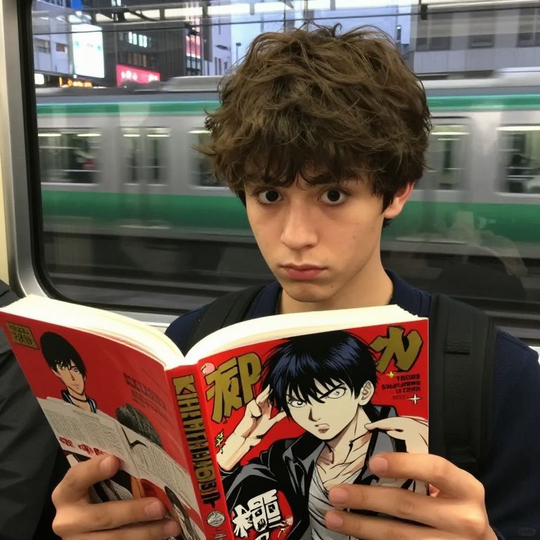 Young man with messy brown hair reading manga on train, wide-eyed expression, wearing black jacket, blurred green train background.