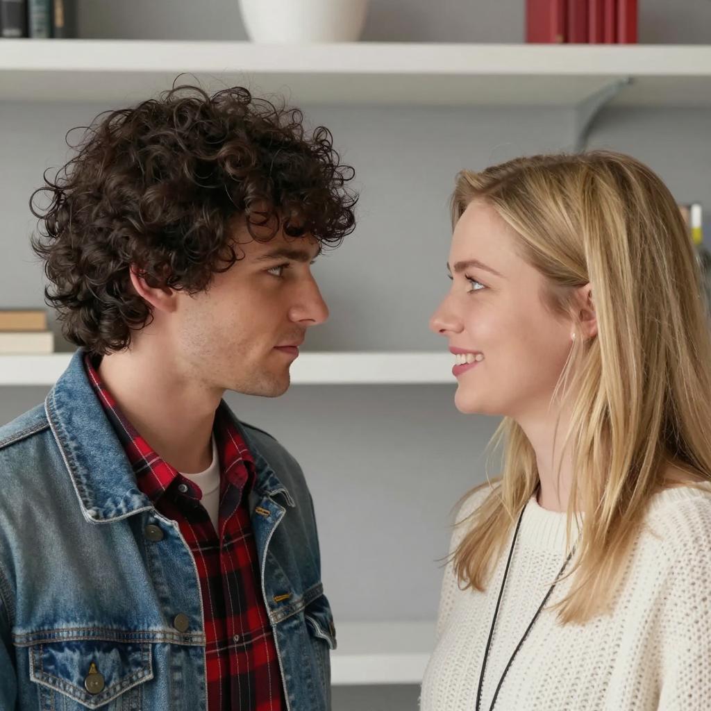 A man with dark hair, wearing a checkered shirt and red vest, leaning forward, looking at a woman with blonde hair, wearing a white wedding dress and tiara. Black ornate frame divides them. Woman smiles at man. Man's expression is focused. Both hands rest on the frame. Background is blurry. Two people.