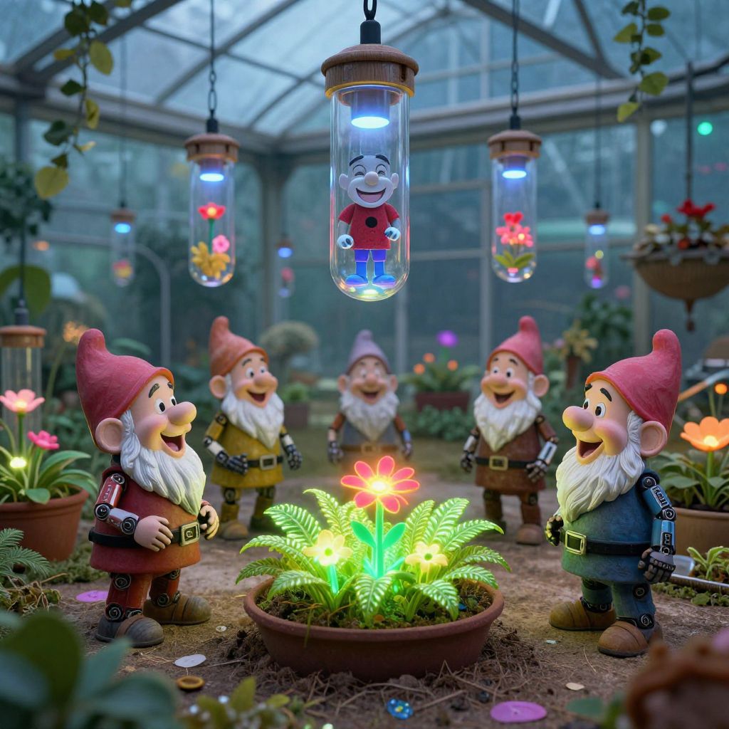 Photograph of a whimsical greenhouse scene featuring five small, cartoonish gnome figurines with red hats, white beards, and brown belts, standing around a brightly lit potted fern with a glowing red flower. The gnomes are surrounded by various potted plants and hanging glass lanterns with smiling faces inside. The background showcases a glass-paneled greenhouse with a blue-tinted sky, and the overall lighting is soft and enchanting, creating a magical, fairy-tale atmosphere. The gnomes are positioned in a circular arrangement, with the central pot as the focal point.