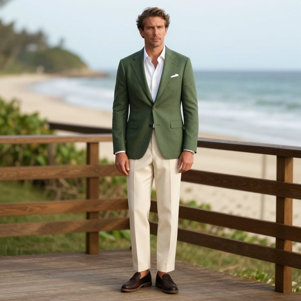 A stylish man stands confidently on a wooden deck overlooking a beautiful beach scene. Dressed in a green blazer and cream-colored trousers, he exudes sophistication and charm against the backdrop of a serene coastal landscape.