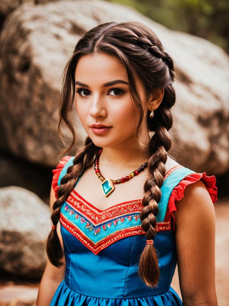 Portrait of a young woman wearing a vibrant blue and red Elena of Avalor inspired dress. She has long brown hair styled in twin braids with a braided crown, brown eyes, and is accessorized with a beaded necklace featuring a turquoise pendant and small matching earrings. The background is blurred with large rocks, emphasizing the subject's detailed costume and hairstyle.