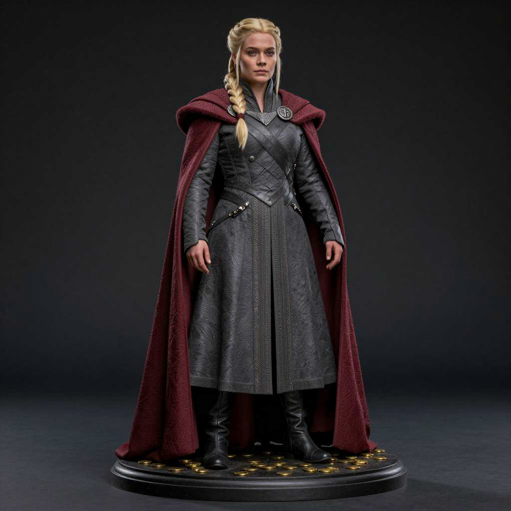 Photograph of a statuesque female figure inspired by Game of Thrones. The figure has pale skin, long blonde braided hair, and a serious expression. She is dressed in a dark gray detailed long coat with vertical stripes, black trousers, black boots, and a flowing deep red cape. The statue stands on a round black base with a textured surface and scattered gold coins. The background is solid black.
