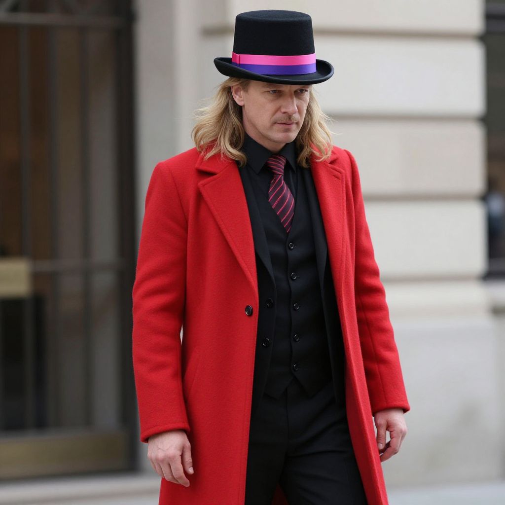 A man with long blonde hair is wearing a red coat with a black vest and black pants. He is also wearing a black top hat with a pink and purple stripe.