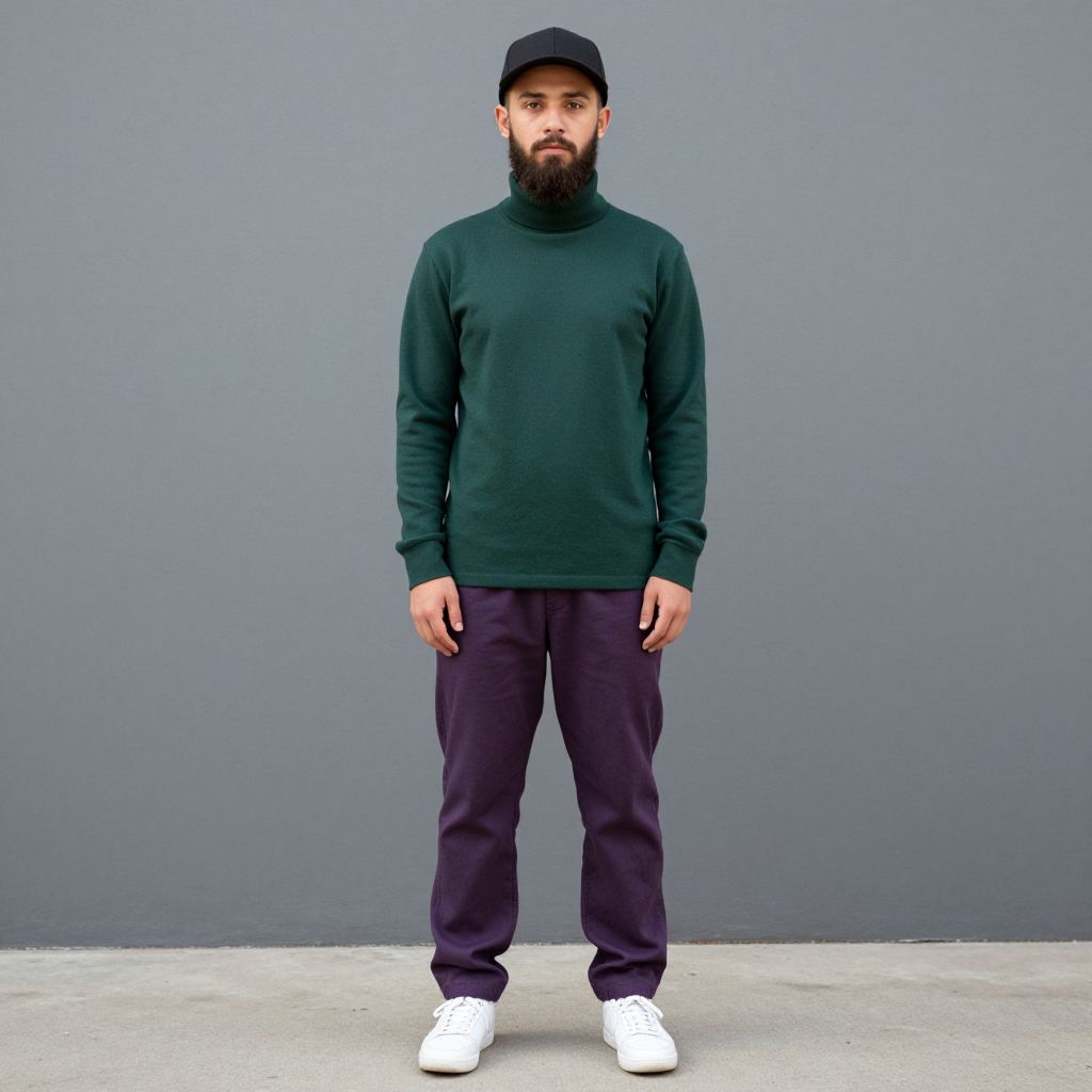 A young man with a chin - style dark brown beard without mustache in a dark black cap, green turtleneck, purple pants and super white sneakers in full height, perfect face