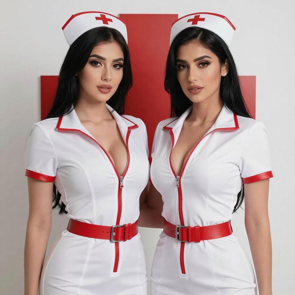 Photograph of two women with long black hair, standing close together. Both wear tight, white nurse outfits with red zippers and red belts. The woman on the left has a deeper neckline, revealing more cleavage. They stand in front of a white background with a red cross symbol.