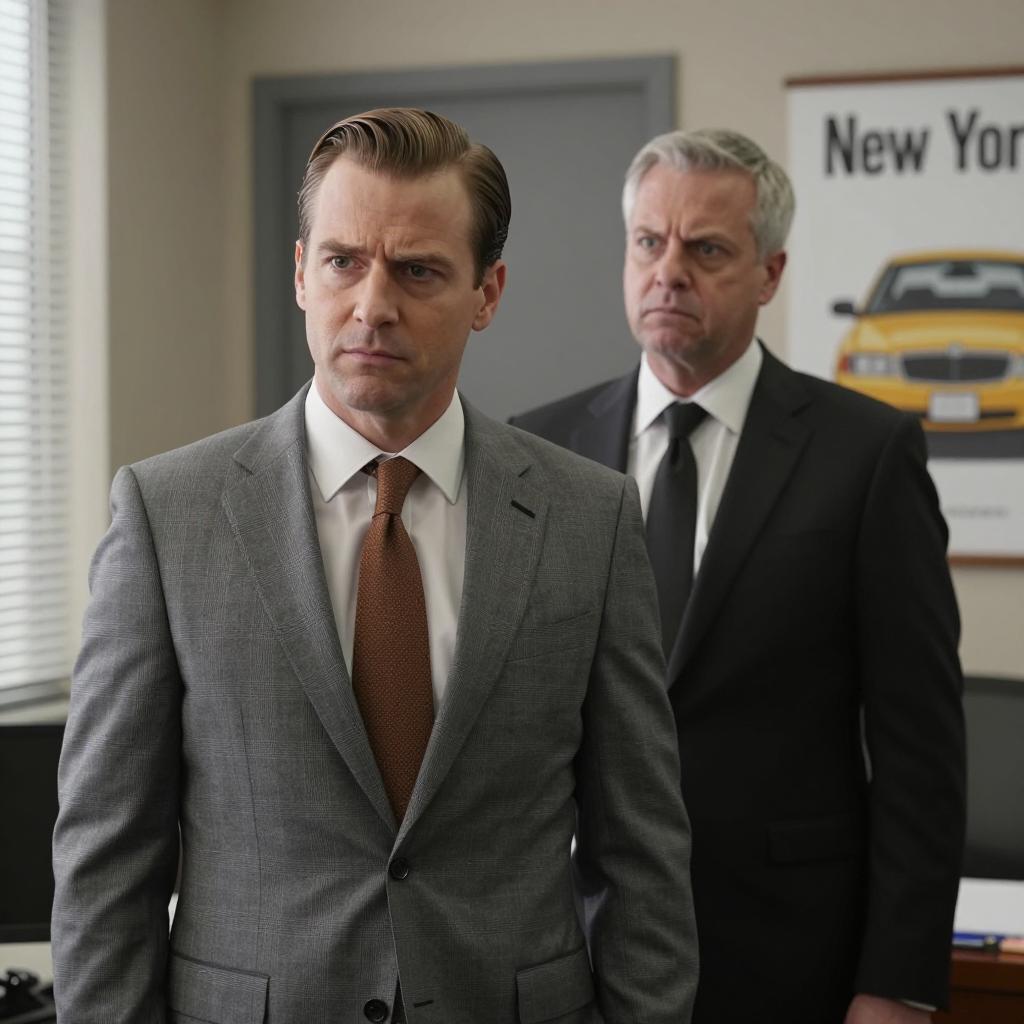 Three adults in formal attire standing indoors against a red wall with a white door. The man in the center has short brown hair, wearing a gray suit, white shirt, striped tie, and a name tag labeled 'Mr. Landon,' showing an intense expression. On his left is a man with dark hair in a black tuxedo, white shirt, and black bow tie, displaying a neutral expression. On the right, a woman with brown hair in a black dress and pearl earrings wears a name tag and has a surprised expression.