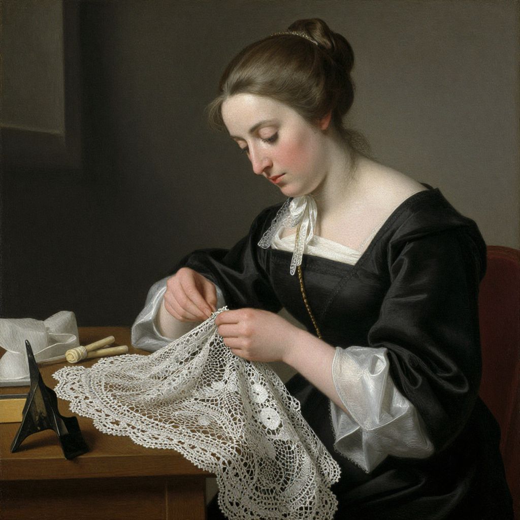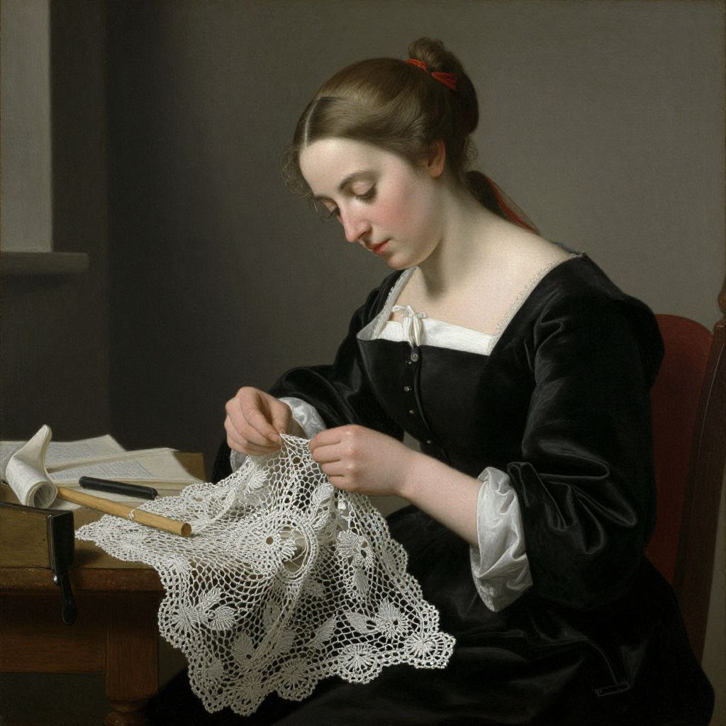 This photograph-like oil painting depicts a fair-skinned woman with brown hair in an updo, wearing a black dress with white lace cuffs and collar, intently sewing a delicate white lace piece. She sits at a wooden table, illuminated by soft light from the left, highlighting her focused expression. On the table, there's a black sewing box, a wooden ruler, and a small piece of fabric. The background is dark and unadorned, emphasizing the woman's concentration on her craft. The style is realistic with detailed textures, capturing the intricate lace and the woman's serene, dedicated demeanor.