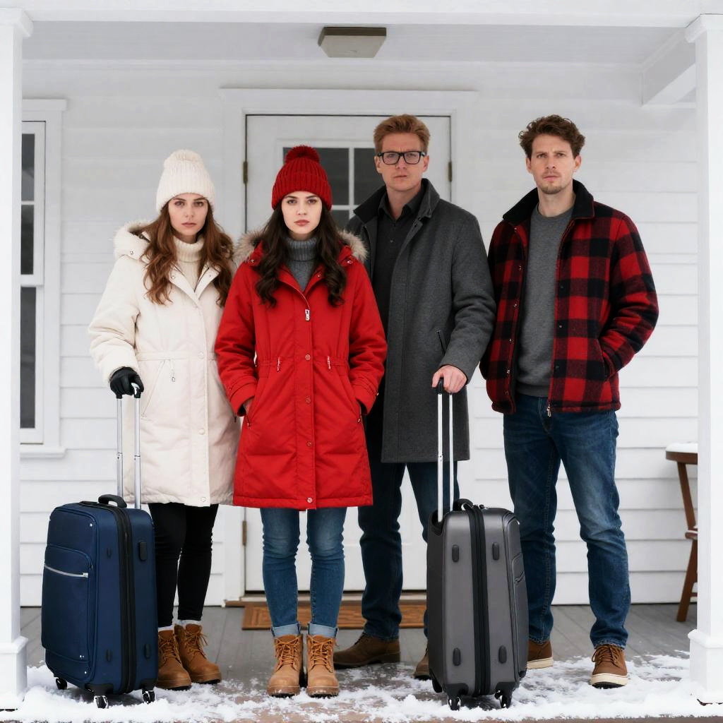 Photograph of four people standing on a porch. Two women and two men. One woman in red coat and beanie, holding a suitcase. Another woman in white coat and hat, with a blanket. One man in glasses and gray coat, holding another suitcase. One man in red plaid jacket and blue pants. White house background. Snow-covered porch. Intense expressions. Casual winter clothing. White door behind them.