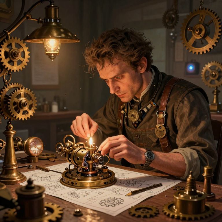 Steampunk inventor with curly brown hair, focused on detailed drawing under a glowing lamp, surrounded by brass gears and clockwork machinery.