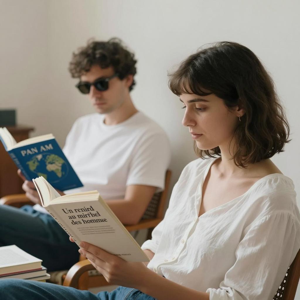 Two people in a room. A woman with dark brown hair, wearing a white off-shoulder shirt, reads "Un renard au milieu des hommes" by Alain Robbe-Grillet. A man with dark hair, sunglasses, and a white T-shirt holds a blue PAN AM book with a globe design. The man is seated in the background, the woman in the foreground. The room has light-colored walls and a table with books and papers.