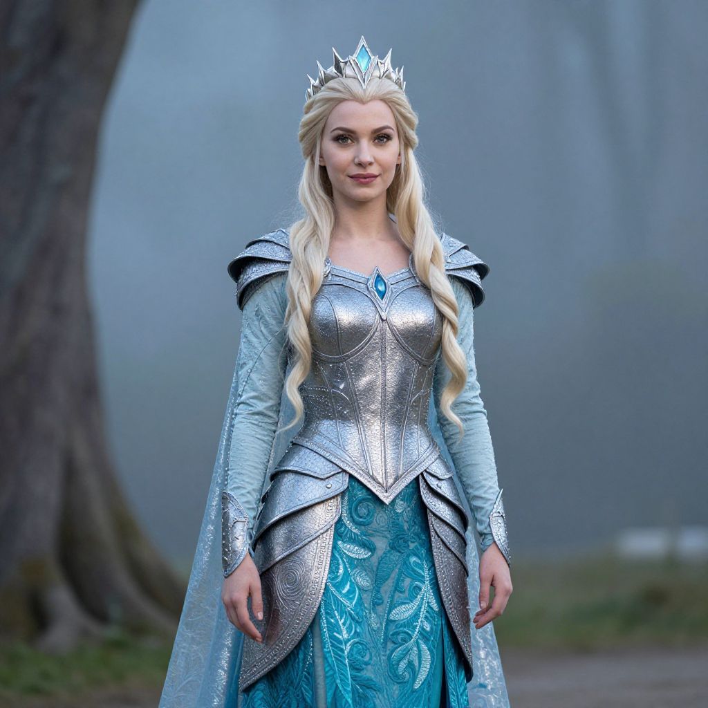 Photograph of a blonde woman with long hair, wearing a silver crown, silver armor over a blue patterned dress, standing in a misty forest