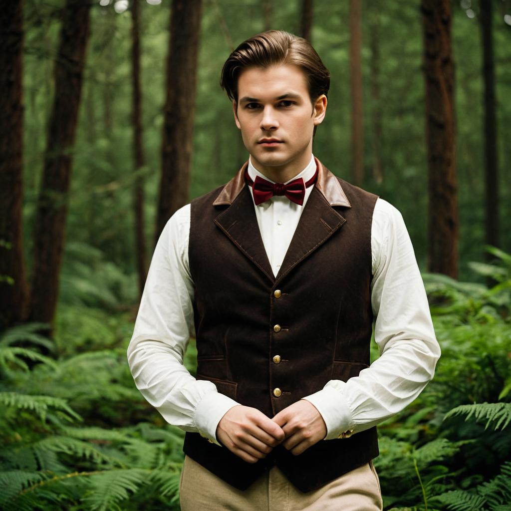Casual prom outfit man, 1boy, male focus, solo, vest, pants, shirt, bow, white shirt, bowtie, blurry background, outdoors, realistic, blurry, brown vest, looking at viewer, long sleeves, tree, standing, arms at sides, blue pants, brown hair, day, black bow