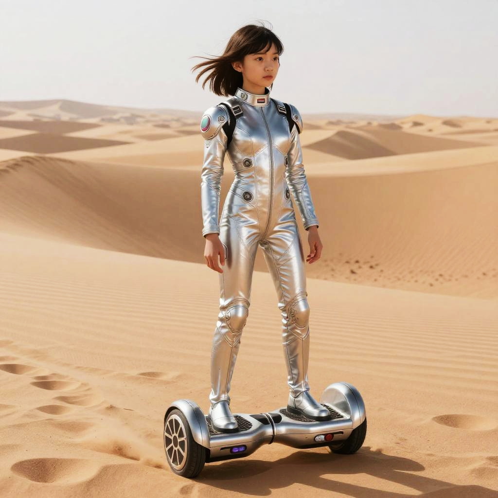 Realistic photo.Hoverboards A lost girl wearing a futuristic silver jumpsuit lost in the desert dunes of Mars, in the style of Hayao Miyazaki, Precisionism style, hyper-detailed, high quality children’s illustration in 4K, comic panels. realistic photo