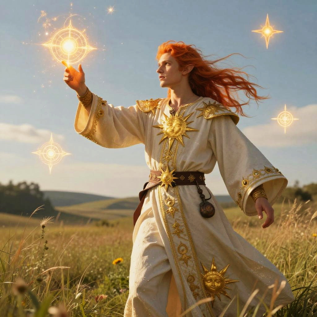 Eladrin male mage casting a spell, his hair flowing and vibrant like a summer breeze, robes decorated with golden sun motifs, standing in an open meadow bathed in warm light, arcane symbols floating around him, fantasy concept art with dynamic lighting and textures.