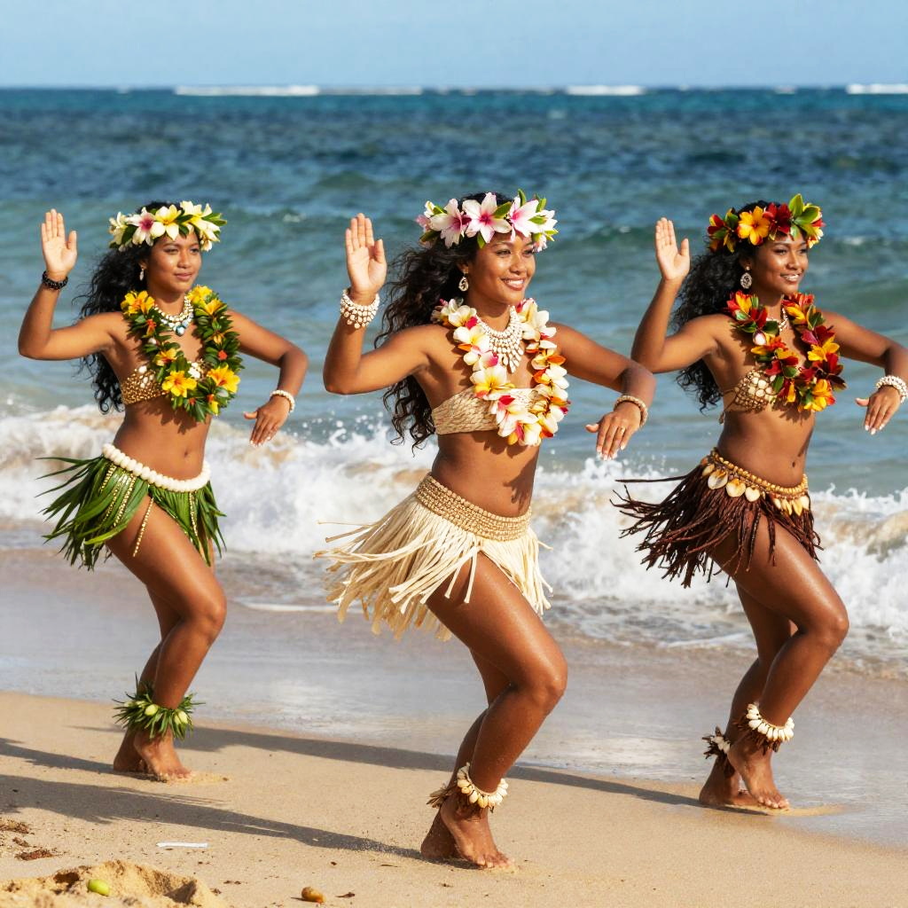 Beautiful Polynesian women in vibrant traditional attire, surrounded by lush tropical flora and vibrant ocean backdrop, soft golden lighting, highly detailed, photorealistic style