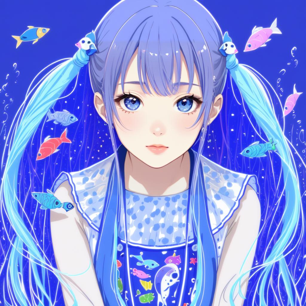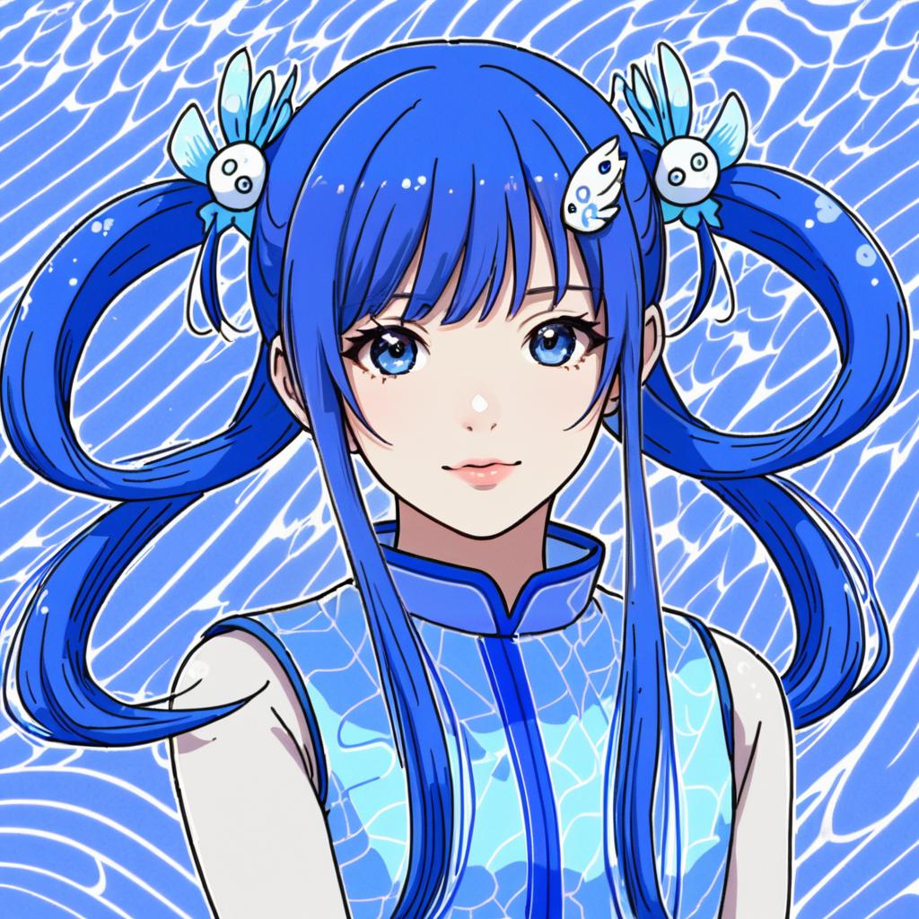 Asari nanami, idolmaster, 1girl, blue eyes, blue hair, long hair, very long hair, fish hair ornament, hair rings, by artist umyonge (lkakeu), anime