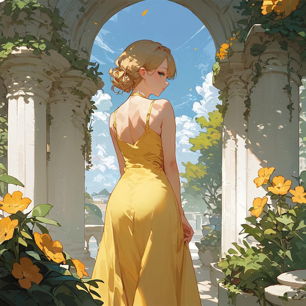 Score_9, score_8_up, source_anime, 1girl, solo, PSchan, from behind, yellow sundress, garden, day, sunshine, smile, looking back