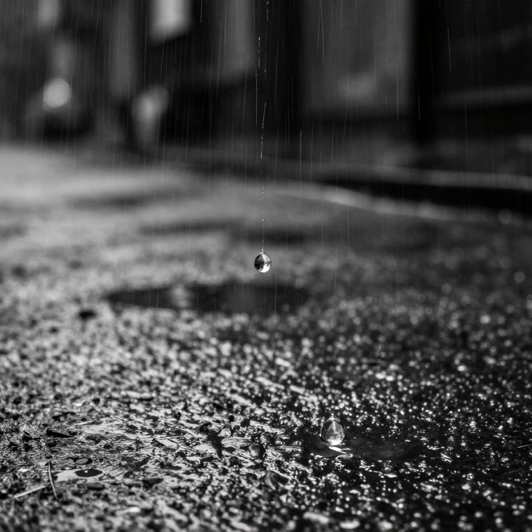 A black-and-white photograph captures a single raindrop mid-fall on a wet, textured pavement. The droplet is centered in the frame, with droplets trailing behind it. The pavement is glistening with water, reflecting light in bright, sparkling highlights. The background is blurred, with indistinct shapes suggesting urban elements, adding a sense of depth. The image uses high contrast, emphasizing the sharpness of the raindrop against the softer, out-of-focus background. The overall mood is moody and introspective, with the rain and wet surface evoking a sense of solitude and calm.