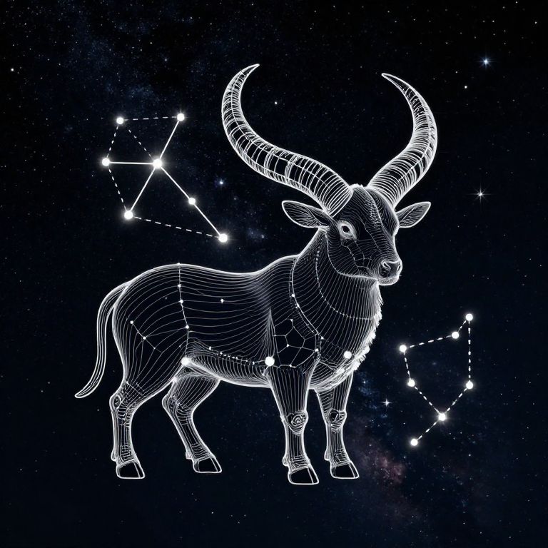Digital illustration of a white, wireframe goat with large, curved horns standing against a dark blue, starry night sky. The goat's outline is composed of bright, white lines, highlighting its muscular build and detailed anatomy. Surrounding the goat are luminous stars and constellations, with dotted lines connecting the stars to form patterns. The goat is positioned slightly to the right, facing forward, with its head turned slightly to the left. The overall style is reminiscent of celestial cartography, blending animal illustration with astronomical themes. The background is rich with small, scattered stars, adding depth and a sense of vastness to the image.