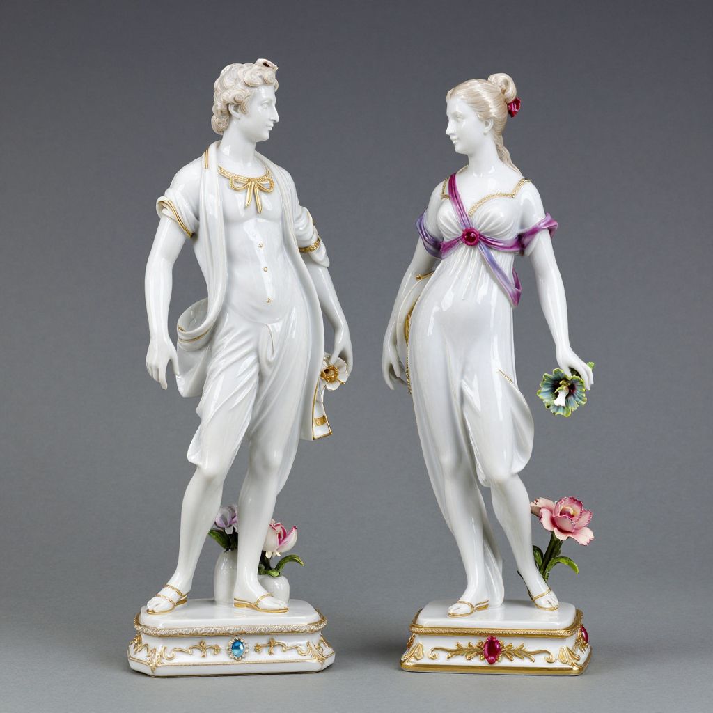 Pair of intricately detailed Meissen porcelain figures depicting a man and woman, standing side by side with complementary floral accents and ornate bases, showcasing classical elegance and craftsmanship.