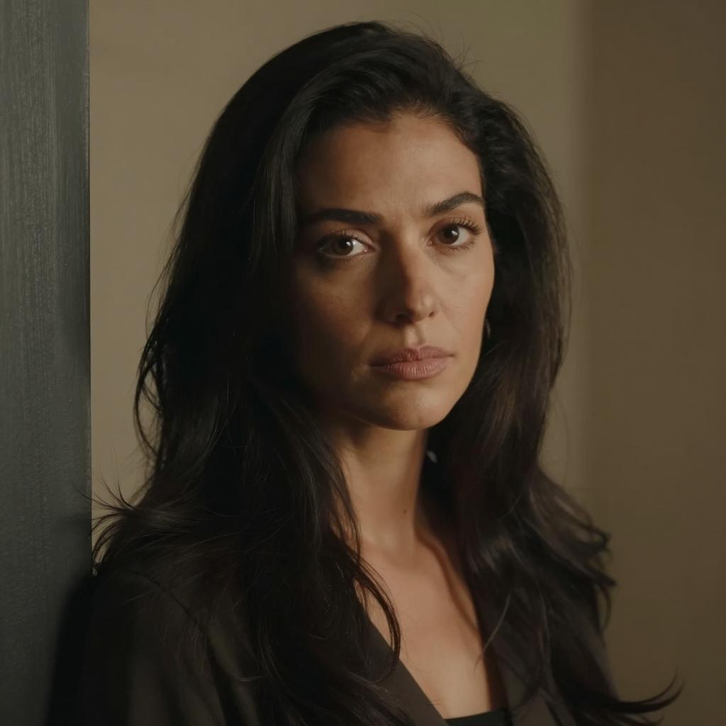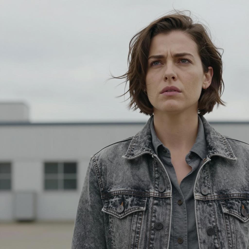 Woman with shoulder-length brown hair holds a silver, handheld device with a twisted antenna. She has a serious expression, light skin, and blue eyes. Background is blurred blue and gray. Close-up shot.
