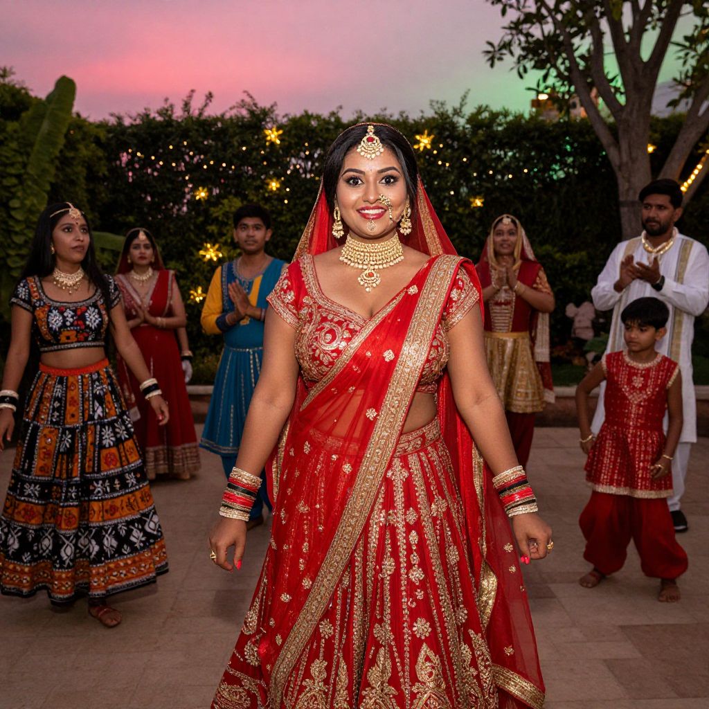 A joyful outdoor costume sangeet function during a summer evening in a garden courtyard, with family members and friends dressed in vibrant regional costumes—some in tribal motifs, others in elegant bridal lehengas with heavy gold embroidery, a woman with dark brown skin and large eyes wearing a red saree with gold borders and a sparkling jhumka, standing in the center with a bright smile, surrounded by children dancing in traditional attire under a pink and green sky with golden lights.. The woman has big breasts and cute face
