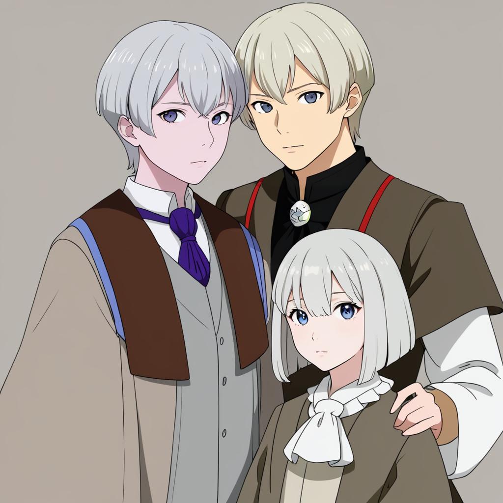 Houlen yabusame, len'en, 1other, grey eyes, grey hair, short hair, short hair with long locks, brown coat, short over long sleeves, puffy short sleeves, wide sleeves, ascot, by artist sunnysideup, anime