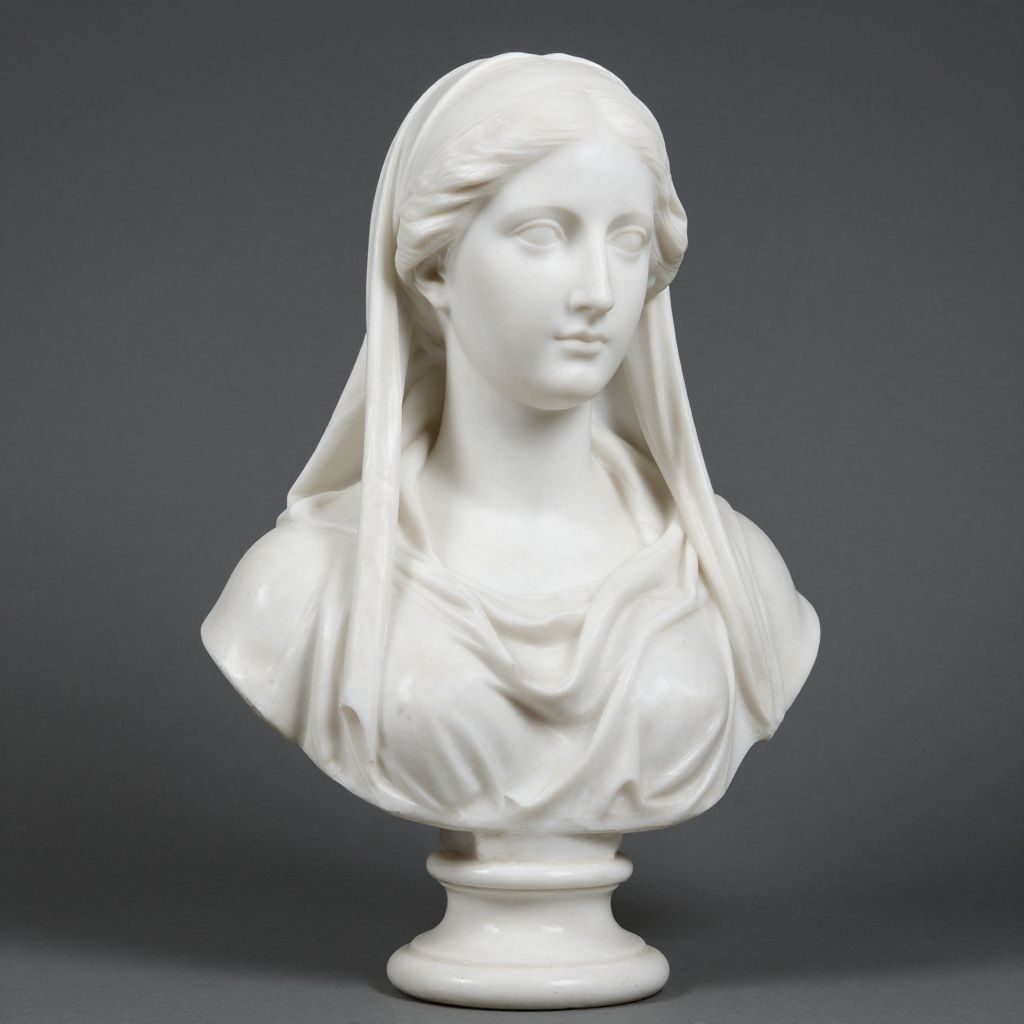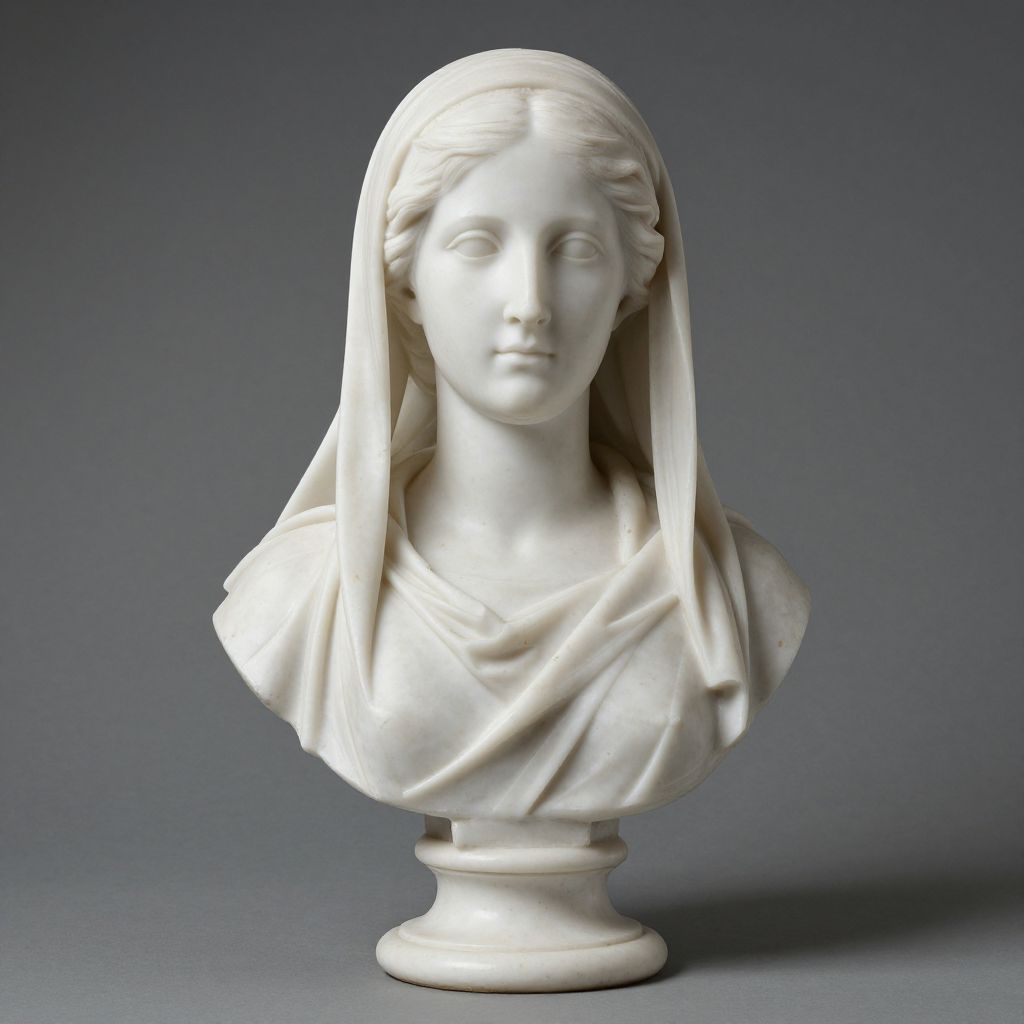 Photograph of a white marble bust of a serene woman with a draped veil, featuring delicate facial features and classic style.