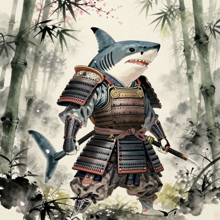 Anthropomorphic shark samurai in traditional armor, standing in a misty bamboo forest at dawn, cherry blossom petals falling around, poised and ready for battle, intricate armor design, detailed fish scales, serene yet intense mood, Japanese watercolor and ink style