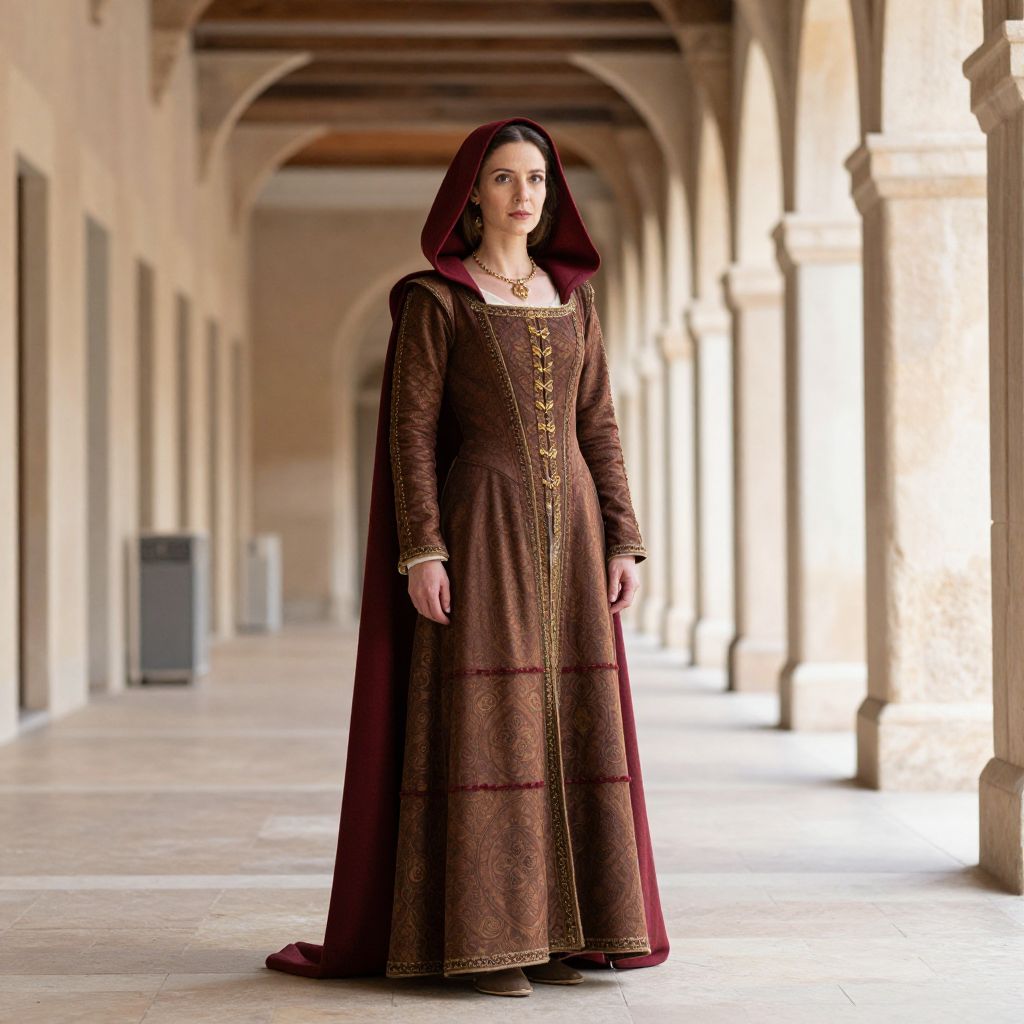 Ravenna Costume, woman in medieval costume standing in a hallway with a red hood