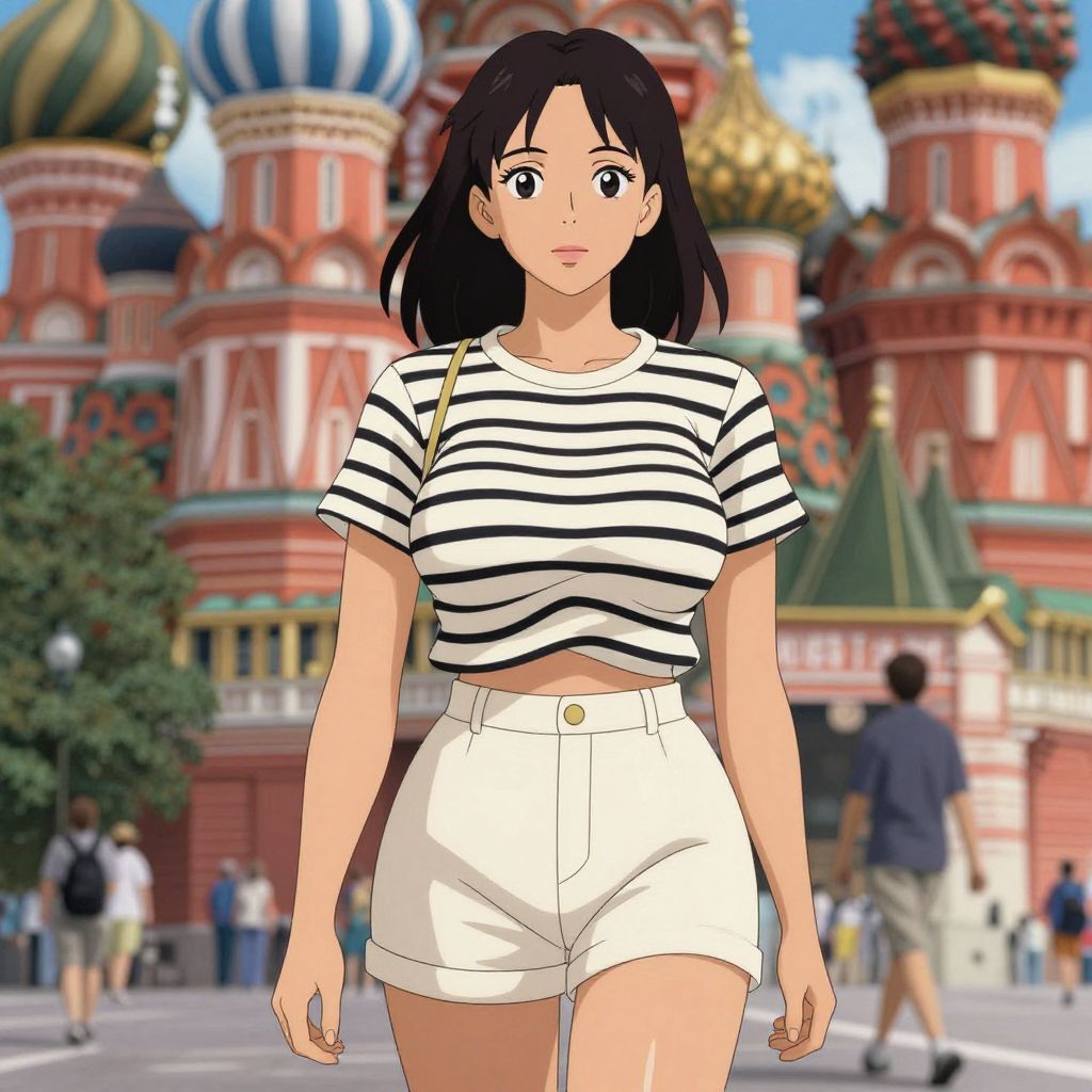Anime-style drawing of a woman with black hair, wearing a striped shirt and white shorts, in front of the colorful domes of the Kremlin.
