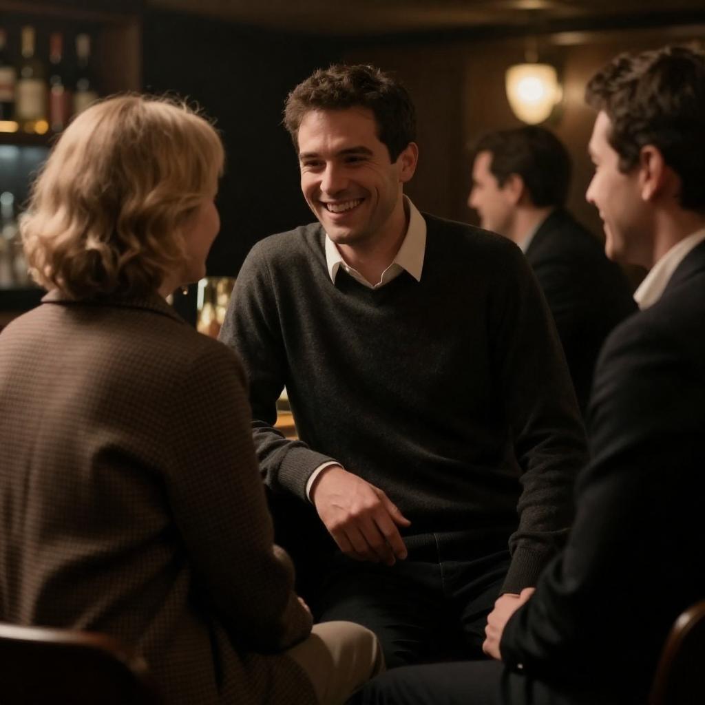A dimly lit bar scene featuring a man with short dark hair wearing a gray sweater over a white collared shirt, laughing and engaging in conversation with a woman with blonde hair dressed in a brown checkered coat. Two other men in dark formal attire are seated nearby, with soft warm lighting creating an intimate atmosphere.