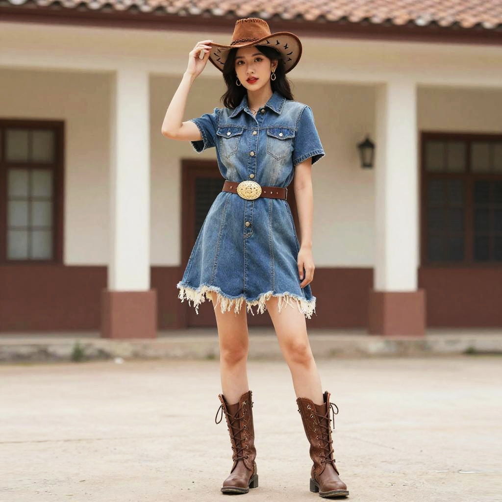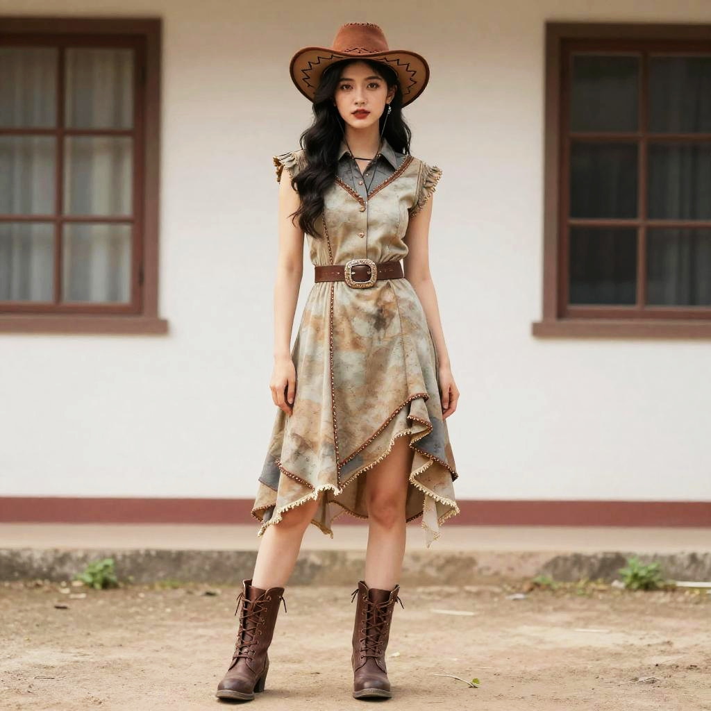 Western Gown Costume, woman in a cowboy hat and dress standing in front of a building