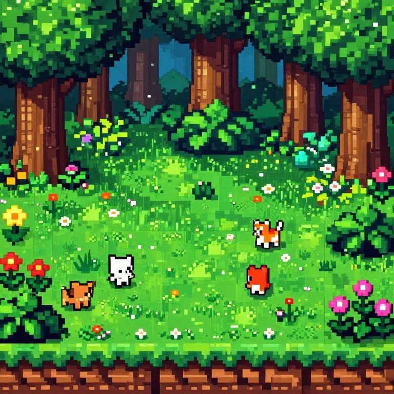 Pixel art AI exploring a pixelated digital forest, surrounded by blocky trees and pixelated animals, pastel color scheme, whimsical fantasy vibe, soft pixel gradients and dynamic lighting effects, pixel art adventure game style.