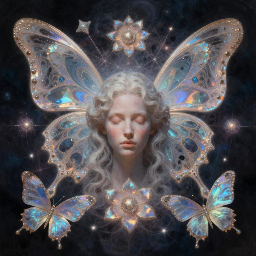 Flow State Psychedelic Portrait of a mirage phoenix made of flaming petals and cosmic embers; phantasm realm; ethereal; surreal; kaleidoscopic light beams; ornate textures, fantasy concept art, 8k resolution; smooth detailed matte painting, complementary colors, by Mark Brooks and Dan Mumford