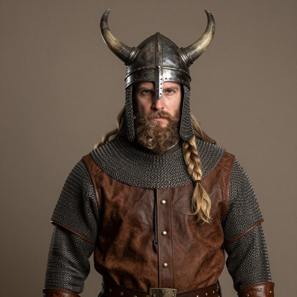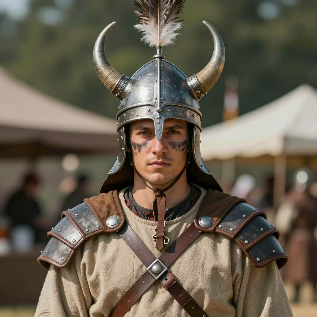Genji costume, photorealistic, close-up of young man in ancient Viking-style armor, silver helmet with horn-like protrusions and feathered top, beige tunic with brown shoulder pads and sash, gray face paint, blurry outdoor market background, warm sunlight, standing, serious expression, detailed ures on clothing and helmet, historical fantasy style, realistic lighting and shadows, medieval European setting, detailed facial features and attire, blurred green trees in background