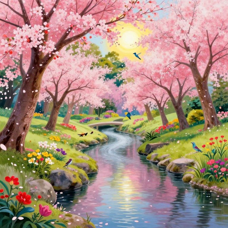 A realistic landscape, Japanese park, trees with petals, small river, birds, kolibri in background, flowers, sun perfection style, vivid colors, colorful, Thomas Kinkade style, Colorful Chaos Cracks and Drops