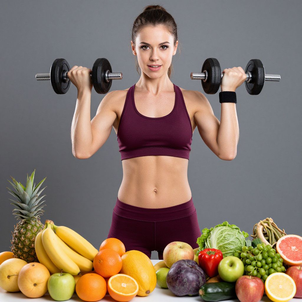 Fit woman lifting weights surrounded by vibrant fruits and vegetables, symbolizing a balanced lifestyle of exercise and nutrition.