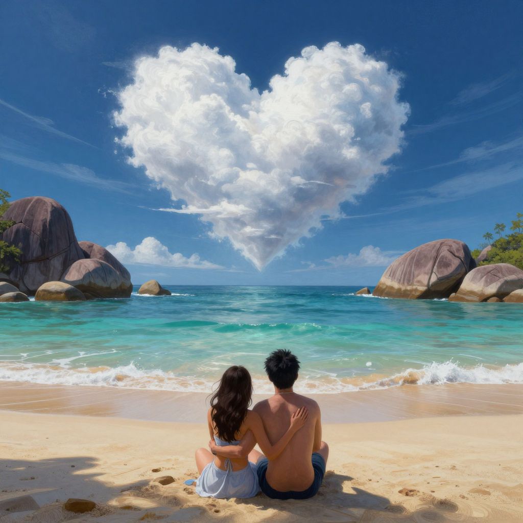 Photograph of a serene beach scene with a couple sitting on the sand, facing a turquoise ocean. The sky is vivid blue with a large, heart-shaped cloud. The couple, with the woman's long black hair and the man's short black hair, wear casual clothes; she in a white top and he in a white t-shirt. Surrounding them are large, smooth, brown rocks. The sandy beach is light yellow, and the ocean is calm with gentle waves. The woman's right arm is around the man's waist, and their legs are slightly apart. The scene is bright and sunny.
